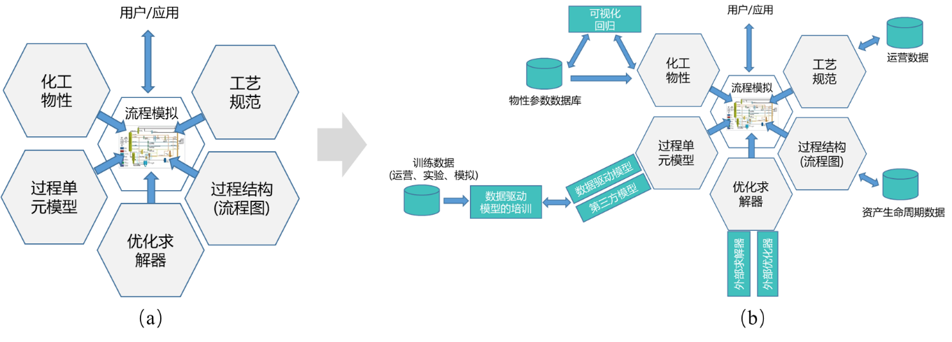 化工流程模擬軟件同樣向平臺化發(fā)展。化工流程模擬軟件應(yīng)用于工藝設(shè)計、虛擬開車、操作員培訓(xùn)、生產(chǎn)優(yōu)化等工廠全生命周期。經(jīng)過40多年發(fā)展,領(lǐng)先供應(yīng)商的產(chǎn)品已經(jīng)集成穩(wěn) 態(tài)模擬與動態(tài)模擬、集成煉油模擬與化工模擬,主要包括5大功能模塊,即工藝規(guī)范、過程結(jié)構(gòu)(流程圖) 、優(yōu)化求解器、過程單元模型和化工物性,如圖2(a所示,并通過CAPE- OPEN軟件接口標準促進了通用流程模擬軟件平臺與單元模型、熱力學(xué)模型組件間的互操作。未來,化工流程模擬平臺軟件的5大模塊將進一步融合生產(chǎn)實時數(shù)據(jù)、實驗數(shù)據(jù)、資產(chǎn)生命周期數(shù)據(jù),進一步集成第三方求解器、優(yōu)化器、大數(shù)據(jù)模型、專用反應(yīng)器模型、物性數(shù)據(jù)庫等,為打造石化工藝數(shù)字孿生提供平臺化支撐,如圖 2(b)所示。