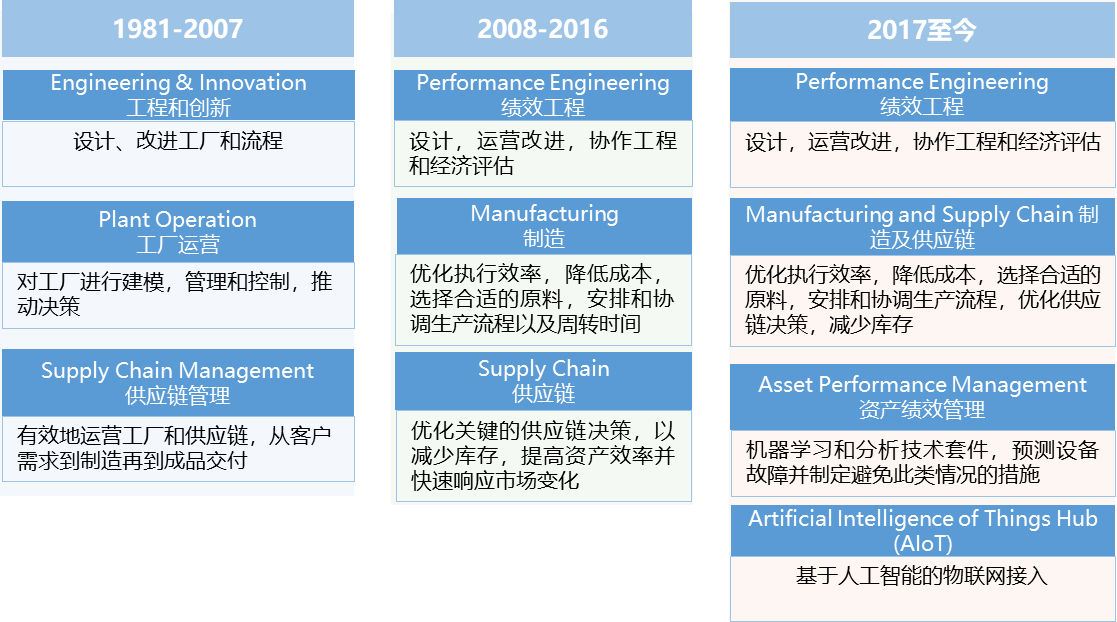 并購發(fā)展階段:從 1996 年起,艾斯本收購了超過 25 個領(lǐng)域中最優(yōu)秀的公司,打造了涵蓋績效工程、制造與供應(yīng)鏈、資產(chǎn)績效管理三大類軟件的產(chǎn)品線,廣泛應(yīng)用于能源、化工、制藥、工程設(shè)計以及其他采用化學(xué)工藝生產(chǎn)產(chǎn)品的行業(yè),如圖 3 所示。這與艾斯本從流程模擬、優(yōu)化到人工智能的業(yè)務(wù)發(fā)展邏輯保持同步。2021年 10 月,艾默生以 60 億美元現(xiàn)金獲得艾斯本55% 的多數(shù)股權(quán),并將旗下 OSI 公司的電力軟件和地質(zhì)建模軟件業(yè)務(wù)并入艾斯本業(yè)務(wù)中。