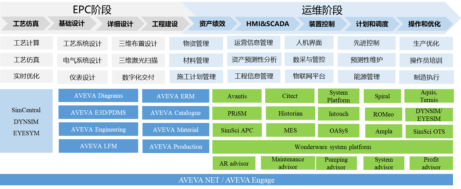 施耐德于2014年收購英維斯(Invesys),2017 年反向收購劍維,并將英維斯的業(yè)務(wù)與劍維整合。原來英維斯的軟件,包括用于化工流程模擬的 PRO/II、用于換熱設(shè)備和網(wǎng)絡(luò)優(yōu)化的HEXTRAN、用于動態(tài)過程模擬的 DYNSIM、用于在線實時優(yōu)化的ROMeo等,現(xiàn)在都集成在劍維品牌下,形成了工程設(shè)計集成平臺AVEVA E3D、IE&D、流程模擬平臺軟件、資產(chǎn)績效管理套件,提供從工程設(shè)計、工程建設(shè)、數(shù)字化交付到生產(chǎn)運營全生命周期的解決方案,如圖 4 所示。