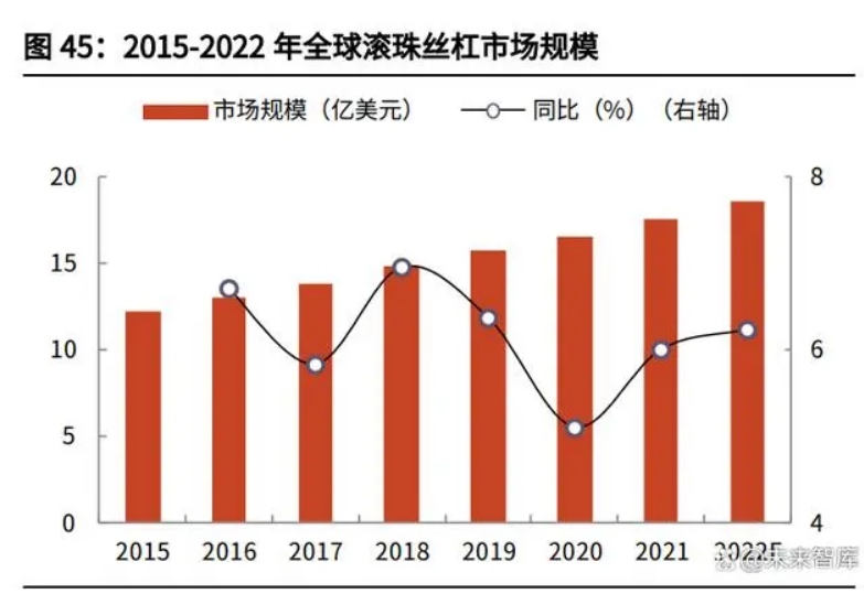 從市場(chǎng)空間來(lái)看,全球滾珠絲杠市場(chǎng)規(guī)模穩(wěn)健增長(zhǎng),中國(guó)已成為最重要的消費(fèi)市 場(chǎng)之一,長(zhǎng)期成長(zhǎng)空間可觀。根據(jù)秦川機(jī)床公告,2016-2021 年全球滾珠絲杠市 場(chǎng)規(guī)模從 13.1 億美元增長(zhǎng)至17.5 億美元;同期我國(guó)滾珠絲杠市場(chǎng)規(guī)模從 16.8 億元增長(zhǎng)至25.6 億元。中國(guó)已成為滾珠絲杠產(chǎn)品重要的消費(fèi)市場(chǎng)之一,約占全 球規(guī)模總量的 20%左右。從市場(chǎng)競(jìng)爭(zhēng)格局看,目前全球主要的滾珠絲杠廠商有 NSK、THK、SKF 等,根 據(jù)華經(jīng)產(chǎn)業(yè)研究院統(tǒng)計(jì),2021 年 CR5 銷售額市占率達(dá)到約 46%,其中主要來(lái)自 歐洲和日本,日本和歐洲滾珠絲杠企業(yè)占據(jù)了全球約 70%的市場(chǎng)份額。
