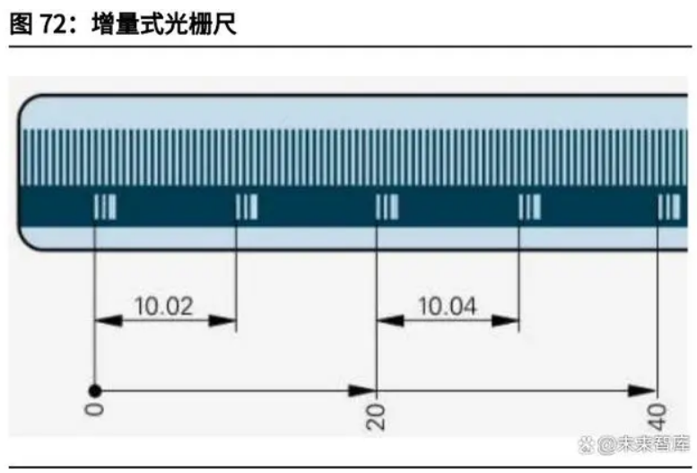 光柵尺是光柵線位移傳感器的簡(jiǎn)稱,是一種利用光柵原理實(shí)現(xiàn)線位移測(cè)量的傳感 器。光柵線位移傳感器主要應(yīng)用于直線移動(dòng)導(dǎo)軌機(jī)構(gòu),可實(shí)現(xiàn)移動(dòng)量的精確顯示 和自動(dòng)控制,廣泛應(yīng)用于金屬切削機(jī)床加工量的數(shù)字顯示和 CNC 加工中心位置 環(huán)的控制。按照材質(zhì)不同,可分為玻璃光柵和鋼光柵;按照測(cè)量原理可分為絕對(duì)式和增量式;按照掃描方式可分為成像掃描和干涉掃描;按照防護(hù)性能不同,可分為封閉式光 柵尺和開(kāi)放式光柵尺。從產(chǎn)品類型及技術(shù)方面來(lái)看,目前增量式光柵尺由于較低的成本和技術(shù)要求,占 有超過(guò) 80%的份額。預(yù)計(jì)未來(lái)幾年,絕對(duì)式光柵尺將保持更快的增長(zhǎng)速度。