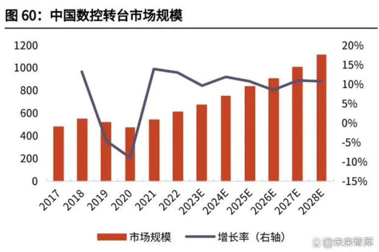 大陸及中國(guó)臺(tái)灣地區(qū)生產(chǎn)廠家生產(chǎn)的中低檔數(shù)控轉(zhuǎn)臺(tái)占據(jù)了我國(guó)大部分的轉(zhuǎn)臺(tái) 市場(chǎng);少部分市場(chǎng)由美國(guó)、德國(guó)、日本等國(guó)家公司生產(chǎn)的高端產(chǎn)品所占據(jù)。內(nèi)地 最具競(jìng)爭(zhēng)力的數(shù)控轉(zhuǎn)臺(tái)生產(chǎn)廠家是煙臺(tái)環(huán)球機(jī)床附件集團(tuán)有限公司,該廠家的產(chǎn) 品體系完備,規(guī)格齊全,種類繁多,且設(shè)計(jì)開(kāi)發(fā)和制造方面具備豐富的經(jīng)驗(yàn)。中 國(guó)臺(tái)灣地區(qū)的德川機(jī)械股份有限公司是專業(yè)數(shù)控轉(zhuǎn)臺(tái)生產(chǎn)廠商之一。國(guó)外有日本 的 NIKKEN(日研)、德國(guó) Peiseler、美國(guó) HASS 公司等專業(yè)的生產(chǎn)廠家。國(guó)內(nèi) 生產(chǎn)的數(shù)控轉(zhuǎn)臺(tái)產(chǎn)品與國(guó)外的產(chǎn)品相比,在精度、速度及可靠性等參數(shù)上仍與國(guó) 外數(shù)控轉(zhuǎn)臺(tái)存在一定差距。2021 年中國(guó)數(shù)控轉(zhuǎn)臺(tái)市場(chǎng)銷售收入達(dá)到了 5.43 億美元,據(jù) QYResearch 預(yù)計(jì), 2028 年可以達(dá)到 11.17 億美元。從產(chǎn)品類型及技術(shù)方面來(lái)看,單軸占有重要地位,2021 年份額達(dá)到 89.43%, 銷量達(dá)到 58678 臺(tái),而雙軸由于價(jià)格較貴,從 2021 年銷量上來(lái)看僅為單軸的 1/9,達(dá)到 6935 臺(tái),但銷售額超過(guò)單軸的 1/3,達(dá)到 1.44 億美元。預(yù)計(jì)未來(lái)單 軸和雙軸的比例穩(wěn)定,在 2028 年,單軸的銷量將達(dá)到 104280 臺(tái),而雙軸達(dá)到 13671 臺(tái)。從產(chǎn)品市場(chǎng)應(yīng)用情況來(lái)看,與立式數(shù)控機(jī)床配套使用的數(shù)控轉(zhuǎn)臺(tái)最多,接近 60%,在 2021 年達(dá)到 38816 臺(tái),而臥式和龍門(mén)分別達(dá)到 19330 臺(tái)與 7467 臺(tái)。未來(lái)增長(zhǎng)速度最快的為龍門(mén)數(shù)控機(jī)床,2022-2028 年的 CAGR 達(dá)到 9.69%。目 前中國(guó)主要廠商包括旭陽(yáng)國(guó)際精機(jī)、寶嘉誠(chéng)、德川機(jī)械、潭佳精密科技和潭興精 工等,2021 年 Top5 廠商份額占比超過(guò) 50%。