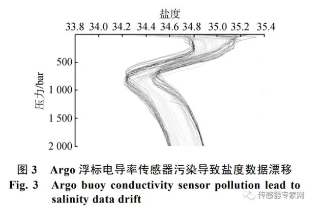 在水下無人系統中, 以在海洋 0~2000 m 范圍上下往復做剖面運動的 Argo 浮標為例, 其壽命要長達 3 年, 電導率傳感器受海洋生物附著等影響, 會產生鹽度數據漂移, 如圖 3 所示。全球大洋 2 000 m 水深的海水鹽度基本為一定值, 但從該圖中明顯看出, 經過多個剖面測量后, 鹽度數據已經漂移了近 0.3, 嚴重影響觀測數據質量。