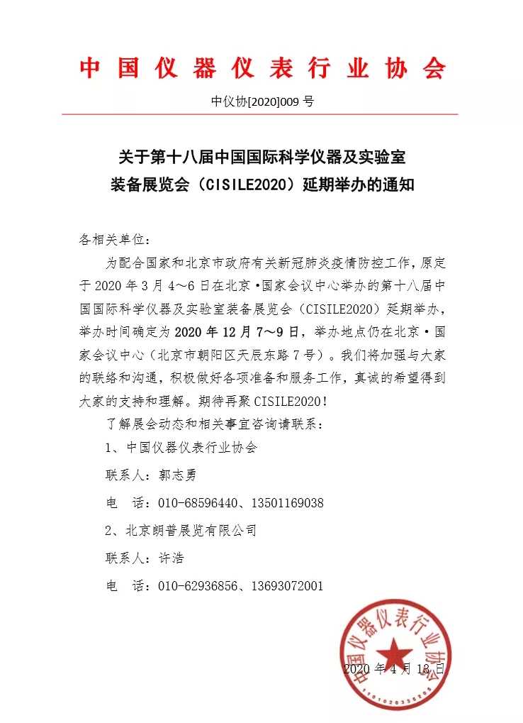 為配合國家和北京市政府有關(guān)新冠肺炎疫情防控工作,原定于 2020 年 3 月 4~6 日在北京·國家會議中心舉辦的第十八屆中國國際科學(xué)儀器及實(shí)驗(yàn)室裝備展覽會(CISILE2020)延期舉辦,舉辦時間確定為 2020 年 12 月 7~9 日,舉辦地點(diǎn)仍在北京·國家會議中心(北京市朝陽區(qū)天辰東路 7 號)。我們將加強(qiáng)與大家的聯(lián)絡(luò)和溝通,積極做好各項(xiàng)準(zhǔn)備和服務(wù)工作,真誠的希望得到大家的支持和理解。期待再聚 CISILE2020!