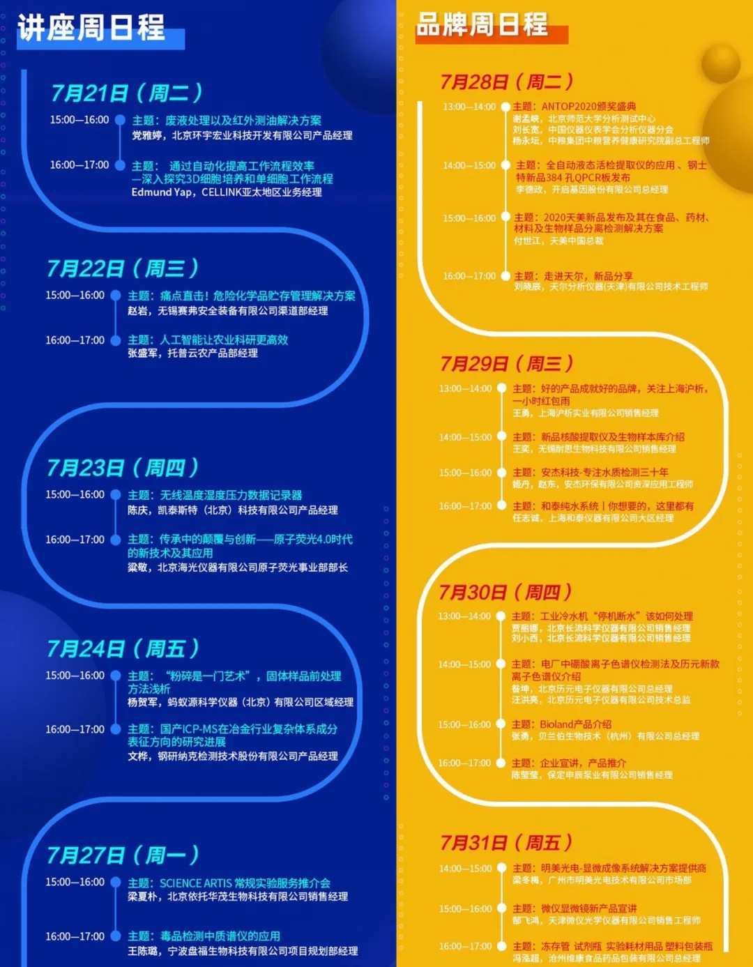 “線上直播”部分,721-31日將有26場次的線上直播,包含了“講座周”、“品牌周”兩大板塊。“講座周”以傳播普及先進技術和經驗為主要內容,“品牌周”以產品推介為主要內容。歡迎科學儀器行業從業者于720-31日期間,參觀“CISILE線上展覽”,觀看線上直播。