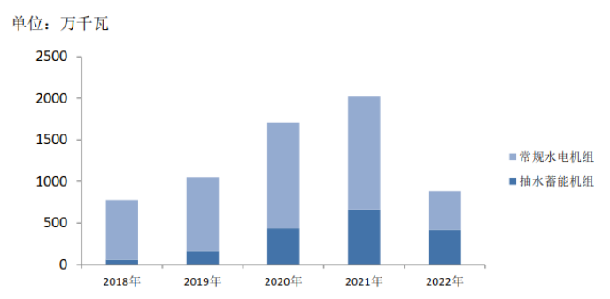 水電設備行業方面,東方電氣、哈爾濱電氣等頭部企業憑借制造能力和水平上的優勢,承接了大部分抽水蓄能及常規水電設備訂單,水電業務經營情況相對穩定;中小水電設備企業大多訂單不足,且由于發電設備上游原材料價格長時間保持高位運行,部分設備訂單出現虧損,經營情況普遍困難。2022年主要發電企業電源工程完成水電投資863億元,同比下降26.5%。常規水電市場需求低迷,抽水蓄能產業進入高速增長期,設備需求旺盛,2022年新增投產抽水蓄能電站880萬千瓦,新核準項目48個、總規模6890萬千瓦。