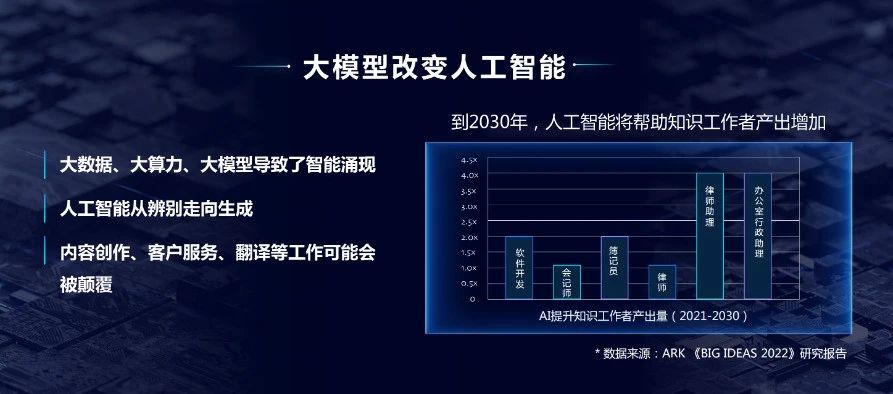 那么這樣會導致什么呢?導致人們的工作效率大幅度地提升。比如說,在內容創作、客戶服務、翻譯這些工作,它的效率會大幅度地提升。所以我們也看到,很多研究機構都認為,在未來的10年,很多工作它的效率會成倍成倍的提升。同時也帶來一些擔心,是不是這樣的效率提升,會使得很多人的工作就沒了?這些人工作丟掉之后,會不會給我們人類帶來不可預知的問題。
