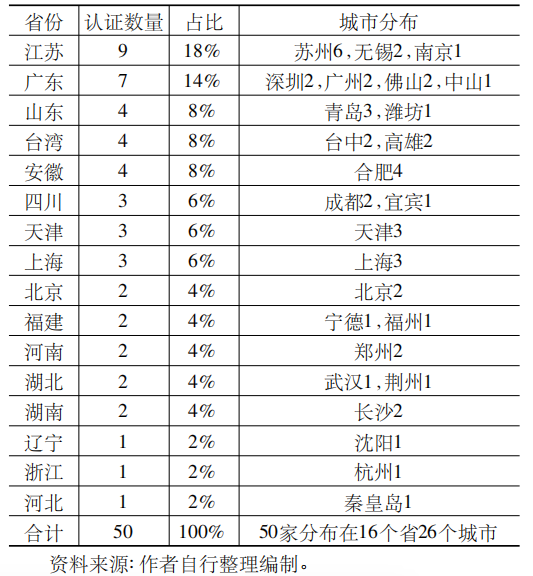 中國獲評“燈塔工廠”50家(其中大陸46家,臺灣地區4家),約占全球獲評數量的4成,成為世界上擁有最多“燈塔工廠”的國家,與中國制造業在全球的地位基本相稱。選擇中國獲評“燈塔工廠”作為研究對象,可以很好地總結我國先進制造企業的數字化改造經驗。因此我們通過網站、專題新聞報道以及研究報告,收集了這50家中國獲評“燈塔工廠”的相關信息,進行了橫向企業層面的統計分析。