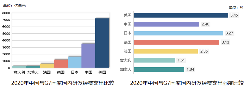 圖2 中國(guó)與G7國(guó)家研發(fā)經(jīng)費(fèi)投入規(guī)模及強(qiáng)度比較(2020年)