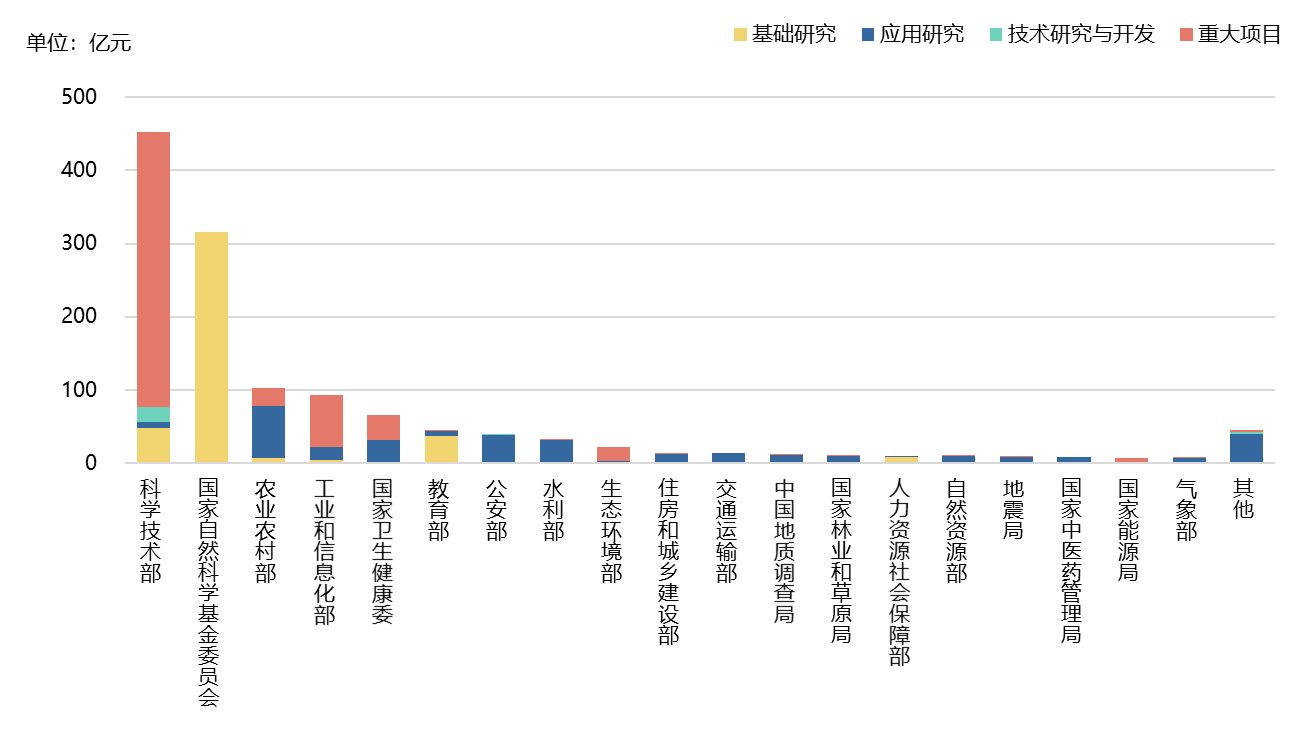 中央政府研發(fā)經(jīng)費(fèi)主要由少數(shù)部門(mén)管理。在40個(gè)中央政府研發(fā)經(jīng)費(fèi)管理部門(mén)中,科學(xué)技術(shù)部和國(guó)家自然科學(xué)基金委員會(huì)(簡(jiǎn)稱(chēng)“基金委”)管理經(jīng)費(fèi)規(guī)模均超過(guò)300億元,占中央40個(gè)部門(mén)管理研發(fā)經(jīng)費(fèi)總支出的50%以上。就研發(fā)經(jīng)費(fèi)管理的類(lèi)型而言,國(guó)家基金委經(jīng)費(fèi)全部用于基礎(chǔ)研究;科技部和工業(yè)和信息化部研發(fā)經(jīng)費(fèi)主要用于重大項(xiàng)目;農(nóng)業(yè)農(nóng)村部則將經(jīng)費(fèi)主要用于應(yīng)用研究。