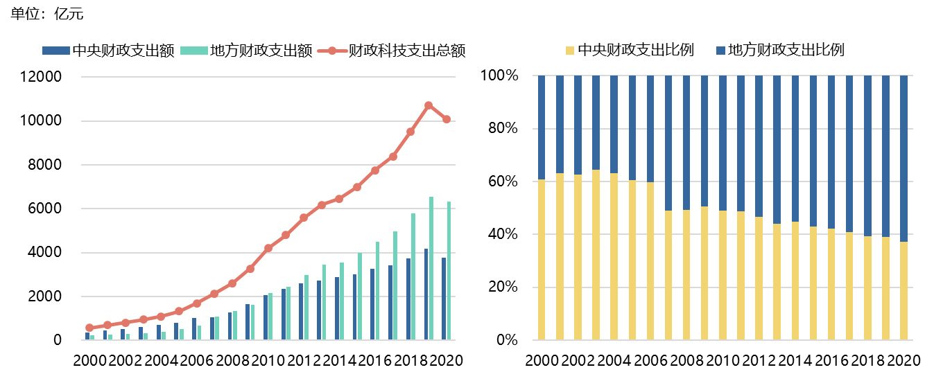 經(jīng)過(guò)20年發(fā)展,中央和地方在國(guó)家財(cái)政科技支出中的占比結(jié)構(gòu)發(fā)生實(shí)質(zhì)性變化。2000年,地方財(cái)政占比不到40%,2009年中央和地方各占50%,到2020年地方財(cái)政占比超過(guò)60%,如今地方財(cái)政已經(jīng)在國(guó)家財(cái)政科技支出中居主導(dǎo)地位,這表明地方政府越來(lái)越重視科技創(chuàng)新,加速推動(dòng)區(qū)域經(jīng)濟(jì)發(fā)展模式從要素驅(qū)動(dòng)向創(chuàng)新驅(qū)動(dòng)轉(zhuǎn)變。