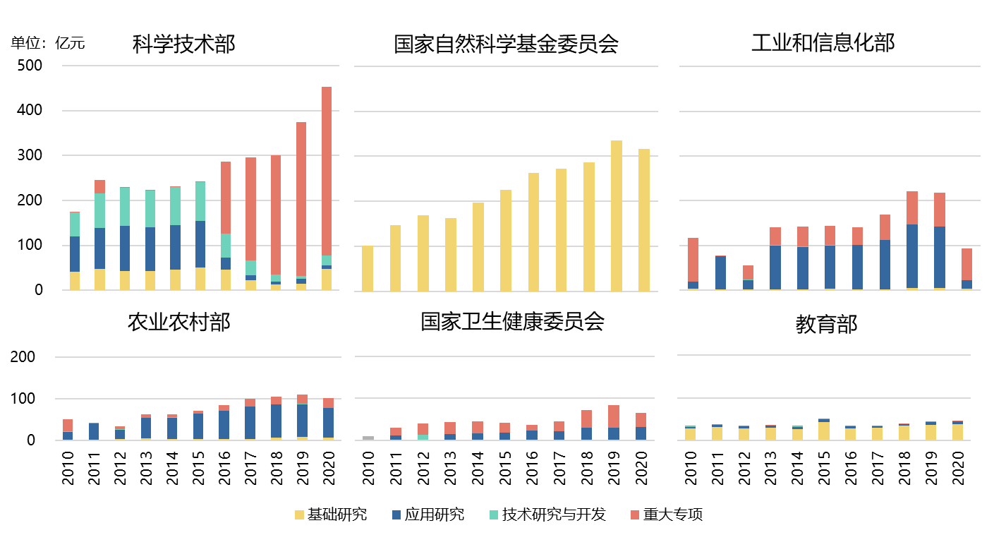 從時(shí)間上看,過(guò)去十年,科學(xué)技術(shù)部和基金委研發(fā)經(jīng)費(fèi)總量大且呈上升趨勢(shì);農(nóng)業(yè)農(nóng)村部研發(fā)經(jīng)費(fèi)總量于2020年首次超過(guò)工業(yè)和信息化部,躍居第三位;衛(wèi)健委和教育部研發(fā)經(jīng)費(fèi)總量保持穩(wěn)定。