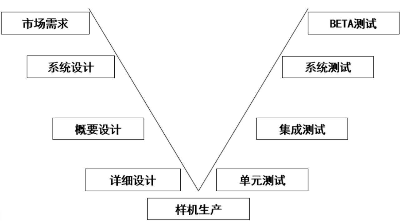 根據研發的具體活動提煉出了產品開發的V”字模型。V字左側的每一個活動都有右側對應的測試手段來保證,每個測試的側重點不同,層層迭進。