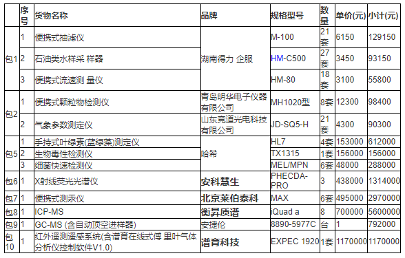 衡昇質譜中標8套ICP-MS,型號為iQuad a;譜育科技中標1套紅外遙測遙感系統,型號為EXPEC 1920;安科慧生中標3臺X射線熒光光譜儀,型號為PHECDA-PRO;萊伯泰科中標6套便攜式測汞儀,型號為MAX。