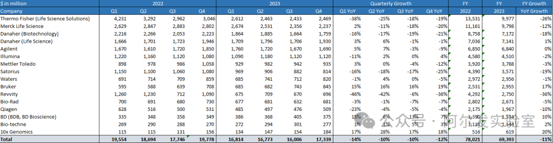 筆者對上市的生命科學(xué)的跨國公司做了一個不完全統(tǒng)計,總共挑選了16家公司,對于某些綜合性的公司,例如賽默飛、丹納赫、默克等,筆者挑出了生命科學(xué)相關(guān)的業(yè)務(wù),盡量去除比如診斷、制藥、化工等業(yè)務(wù)的影響。當然,這其中不可避免混雜了其他非生命科學(xué)的業(yè)務(wù),例如凱杰和伯樂的診斷業(yè)務(wù)等,因為數(shù)字較小,故沒有進行剔除。默克因為要在3月初公布業(yè)績,所以這里的四季度的數(shù)據(jù)為筆者的估計。