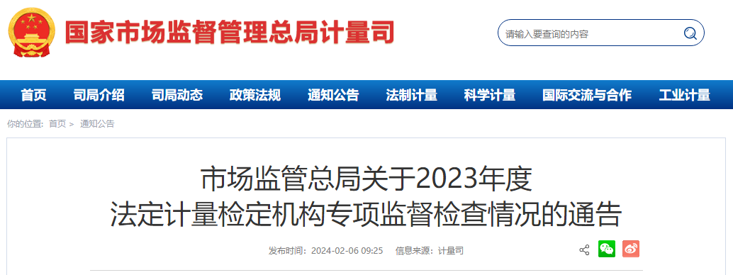 市場監(jiān)管總局關(guān)于2023年度法定計量檢定機構(gòu)專項監(jiān)督檢查情況的通告