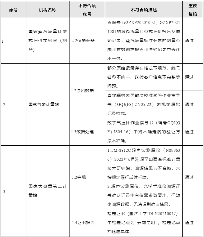 現(xiàn)場隨機抽查150份受檢機構(gòu)存檔證書(報告)及相應原始記錄,發(fā)現(xiàn)存在人員培訓不足、原始數(shù)據(jù)有誤等不符合項,未發(fā)現(xiàn)嚴重違法違規(guī)行為。