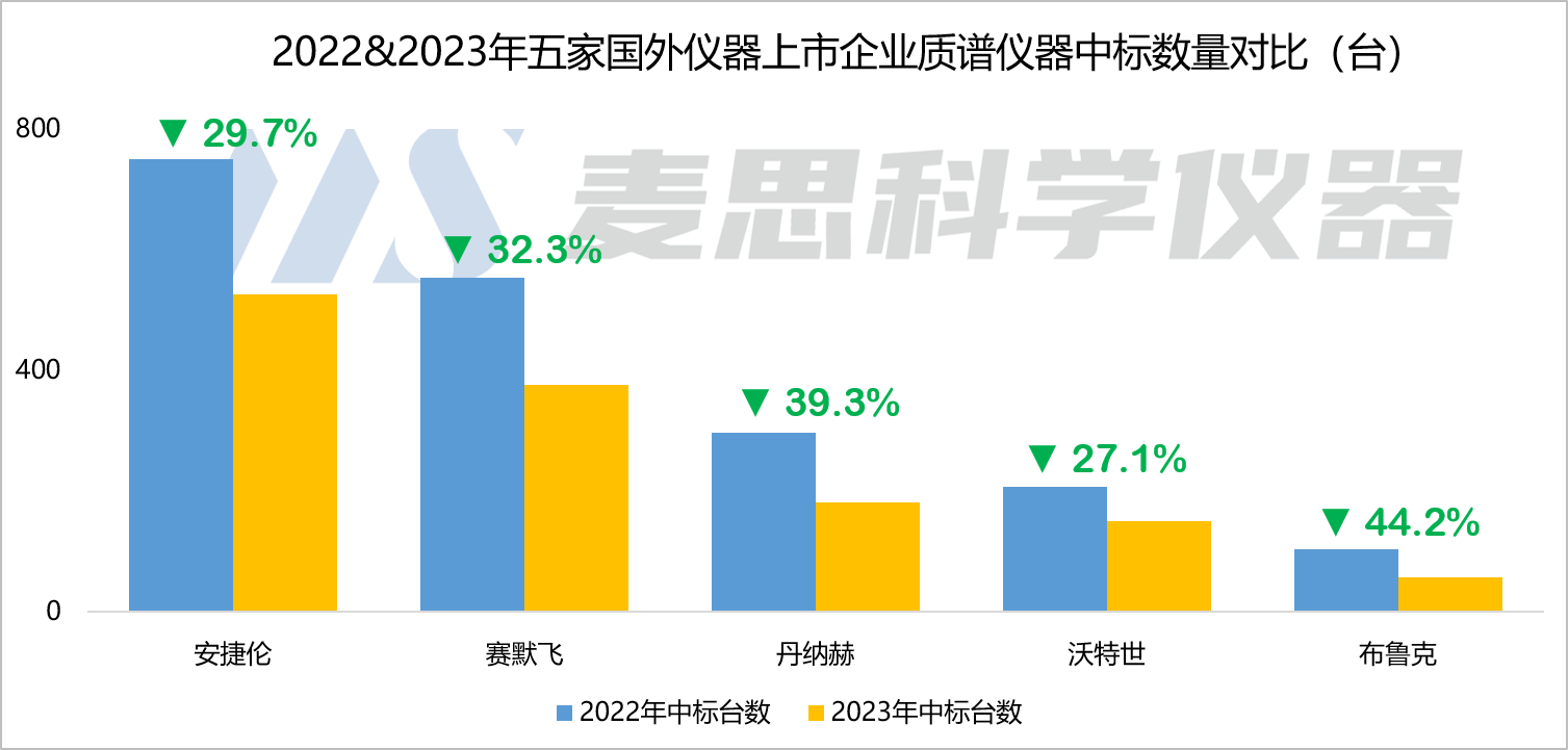 從中標(biāo)數(shù)據(jù)來看,雖然2023年上述五家國外企業(yè)進(jìn)入了中國質(zhì)譜儀器中標(biāo)市場的TOP 10廠商行列,但他們中標(biāo)數(shù)量和中標(biāo)金額同比都有比較明顯的下降。