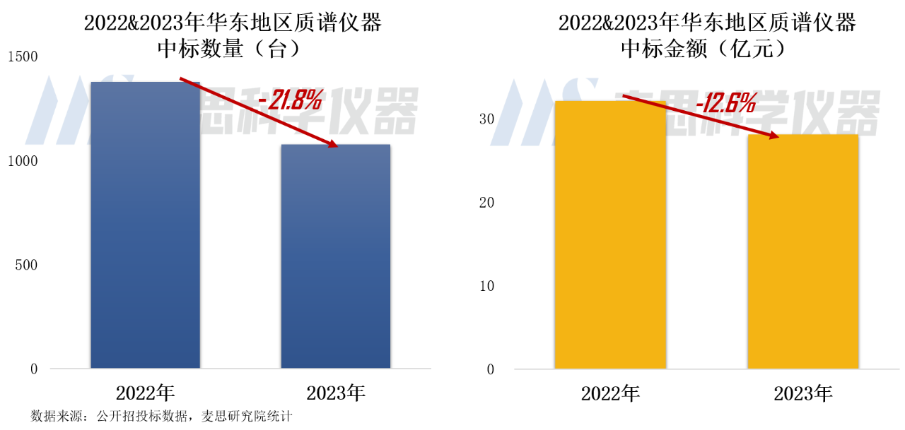 2023年華東地區質譜儀器中標數量約1100臺,同比減少21.8%。中標金額約28億元,同比減少12.6%,降幅小于全國平均值。中標數量和金額在全國市場的占比分別為36.5%41.5%。