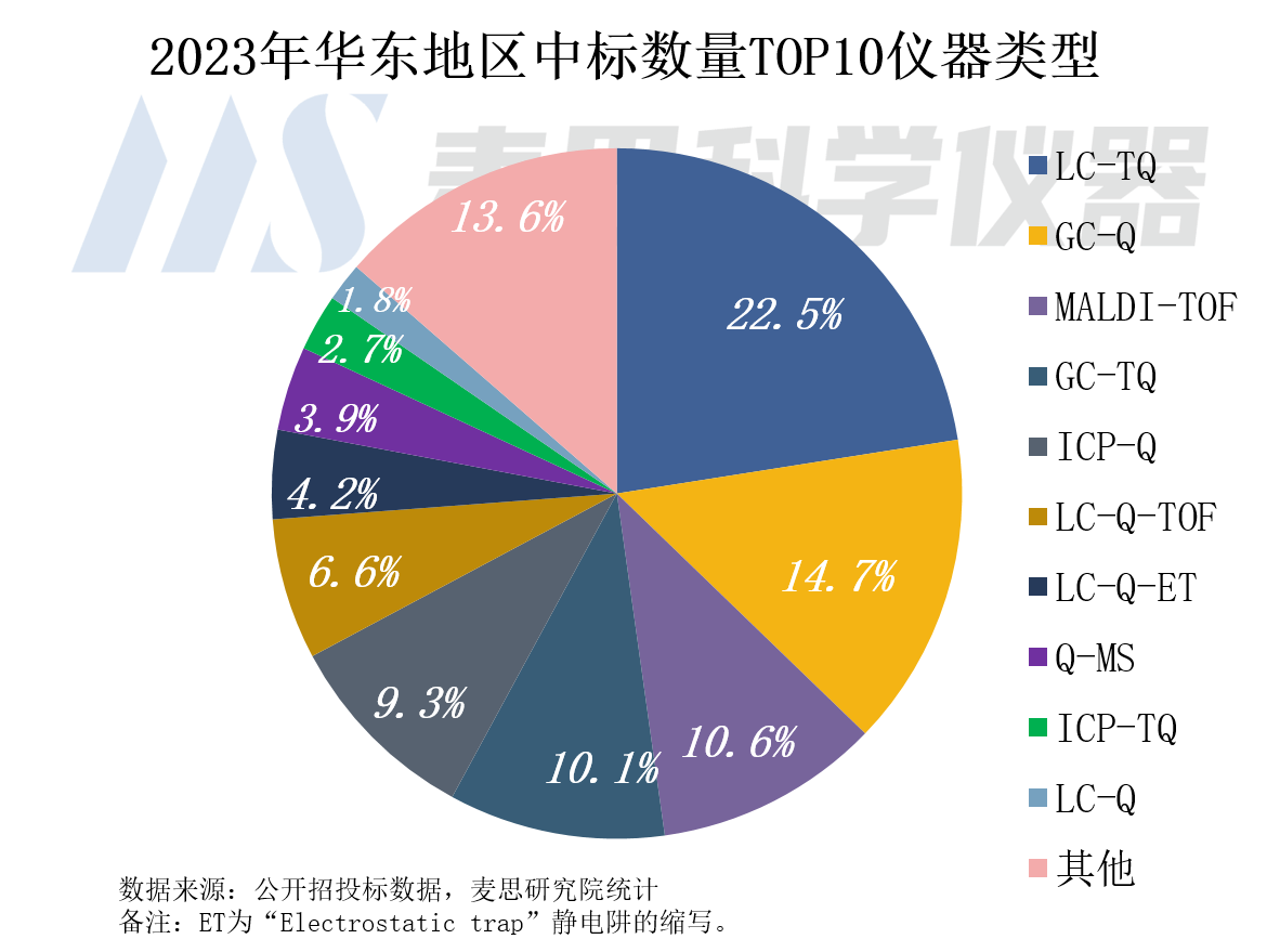 2023年華東地區中標數量Top10儀器類型分別為LC-TQ、GC-Q、MALDI-TOF、GC-TQICP-Q、LC-Q-TOF、LC-Q-ET、Q-MSICP-TQLC-Q,合計中標數量占比86.4%。
