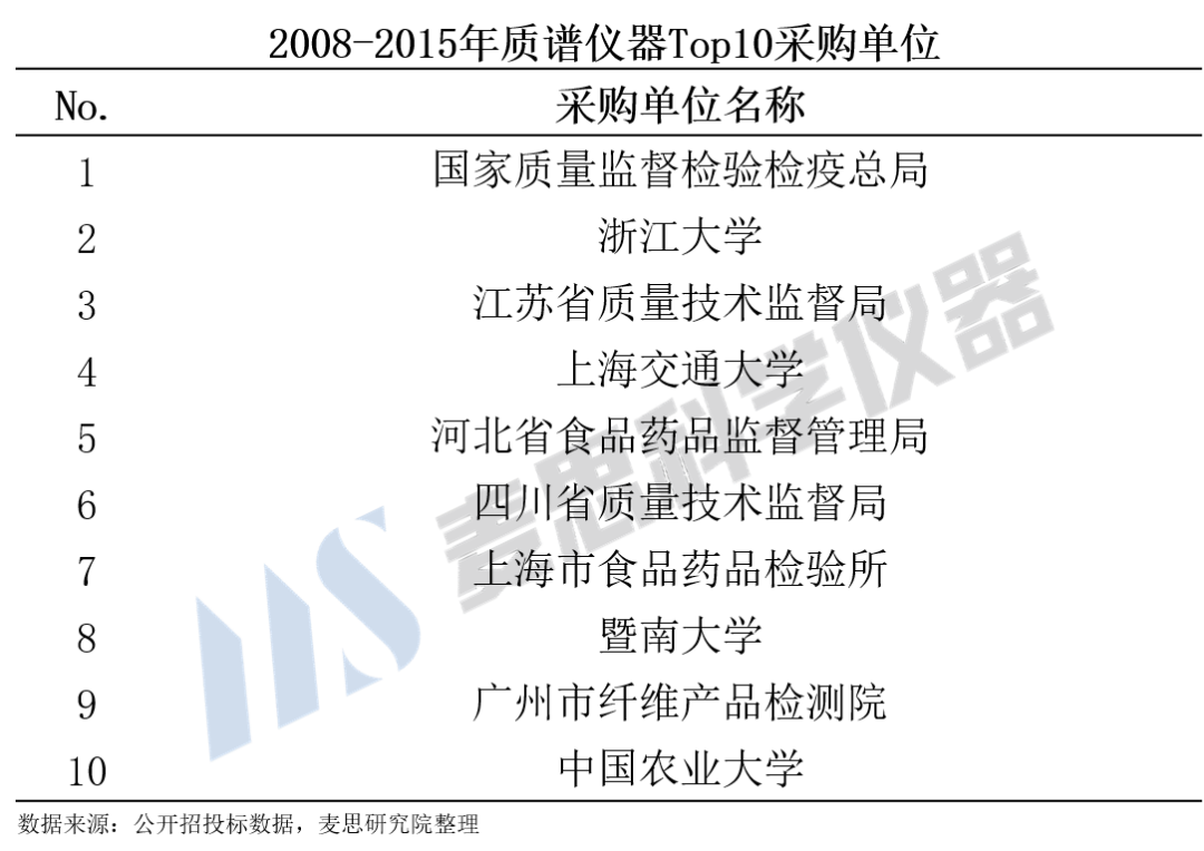 2008-2015年質(zhì)譜儀器中標數(shù)量Top 3領域依次為教育、質(zhì)檢計量和科學研究領域,三者占比約為60%。在采購量最大的前十名用戶中,包括國家質(zhì)量監(jiān)督檢驗檢疫總局、浙江大學、江蘇省質(zhì)量技術監(jiān)督局等單位。