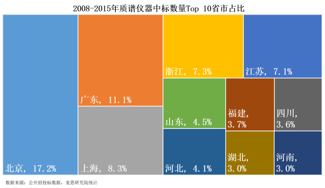 從地理區(qū)域分布來看,北京、廣東、上海、浙江和江蘇是2008-2015年間質(zhì)譜儀器的五大采購區(qū)域,這些地區(qū)的中標數(shù)量合計占全國市場的一半以上。