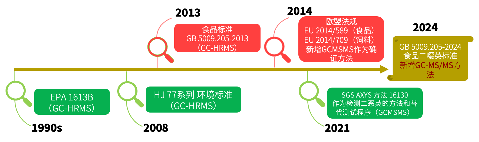 長久以來,高分辨磁質譜(GC-HRMS)被譽為二噁英分析的“黃金標準”,國內外二噁英檢測標準也主要以GC-HRMS為主。歐盟于2014年發布了EU 2014/589EU 2014/709號法規,具有里程碑式意義,首次將氣相色譜-三重四極桿質譜儀(GC-MS/MS)作為評判食品和飼料中二噁英及類二噁英多氯聯苯是否符合歐盟最高限值要求的確認方法。