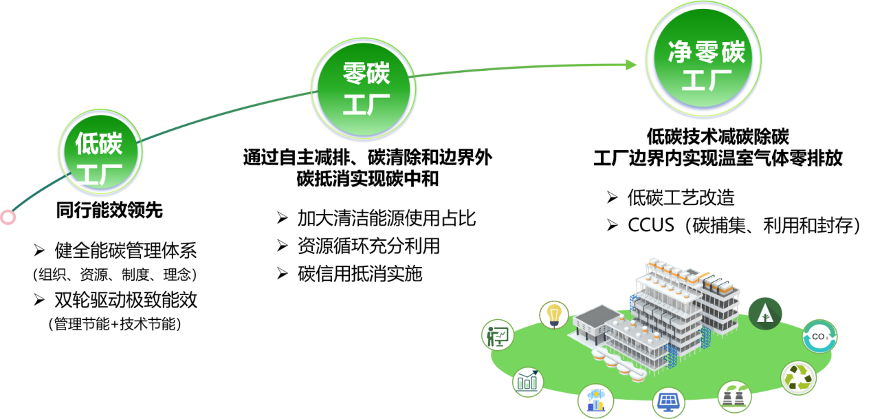 PhaseⅡ—零碳工廠:在低碳工廠的基礎(chǔ)上進(jìn)一步通過能源結(jié)構(gòu)調(diào)整、資源循環(huán)利用、碳清除、碳抵消等方式實現(xiàn)整體對外溫室氣體排放為零。