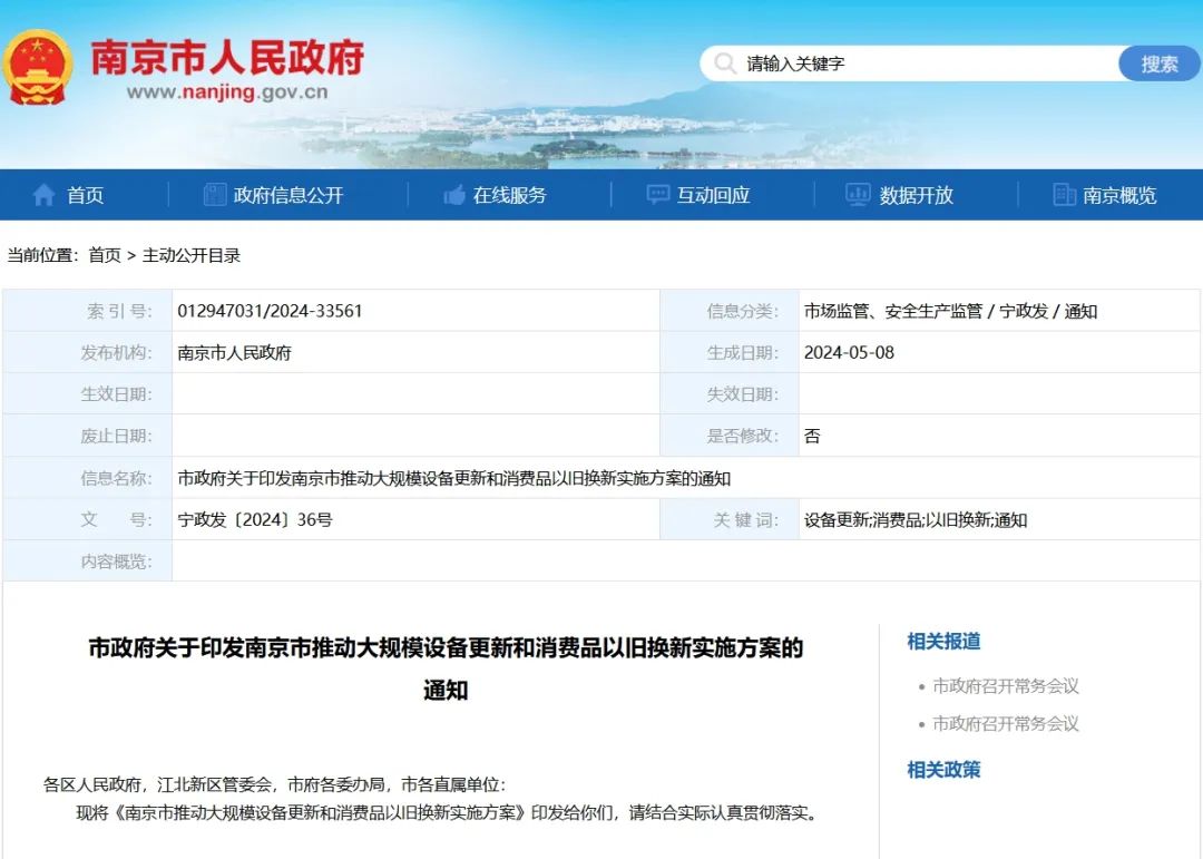5月10日,從南京市人民政府官網(wǎng)獲悉,《南京市推動大規(guī)模設(shè)備更新和消費品以舊換新實施方案》已正式印發(fā)。