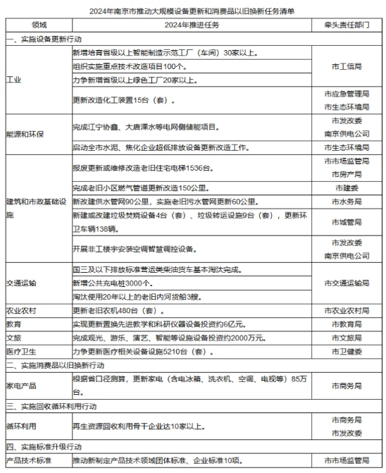 2024年南京市推動大規(guī)模設(shè)備更新和消費品以舊換新任務(wù)清單。