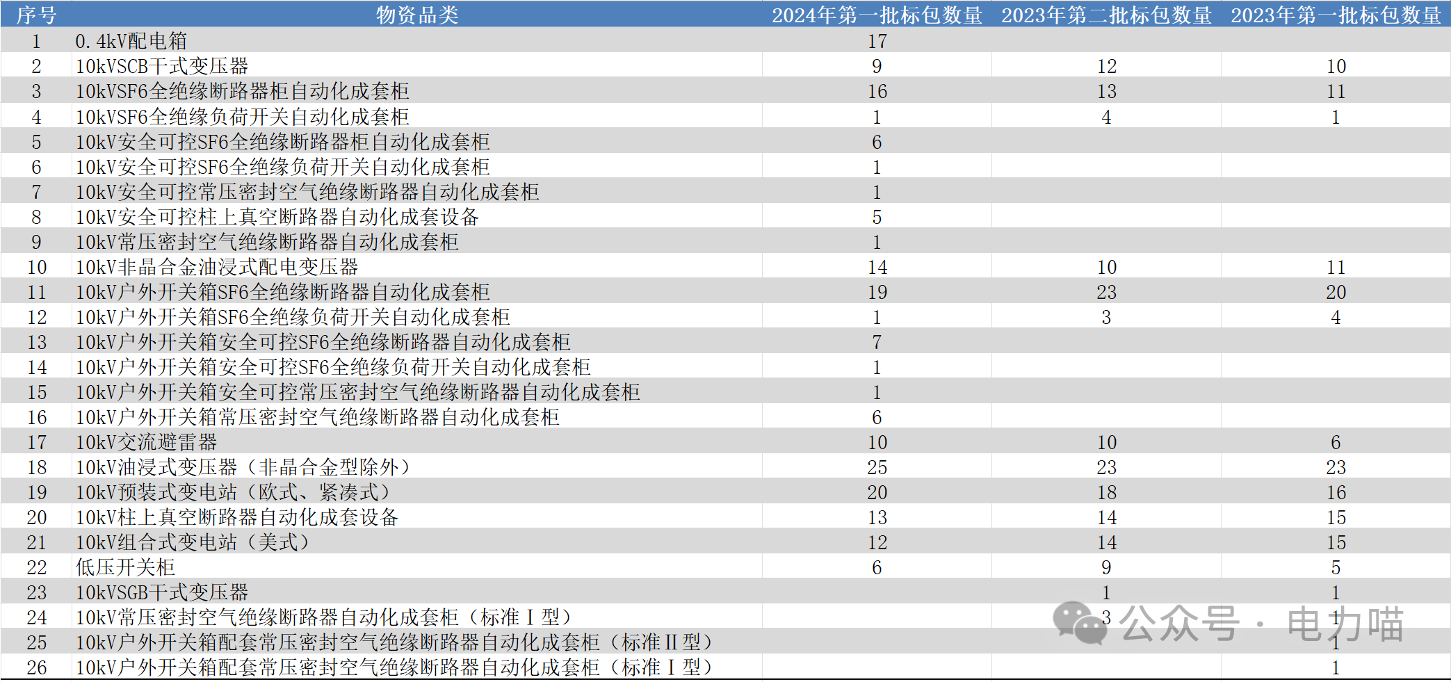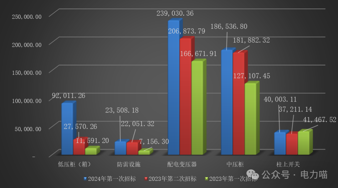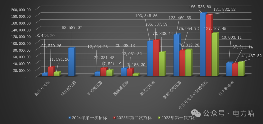 根據(jù)物資目錄分類規(guī)則,配電設備招標的三級物資名稱包括低壓開關柜、低壓配電箱、干式變壓器、線路避雷器、箱式變壓器、油浸式變壓器、中壓開關自動化成套柜、柱上斷路器共八種。