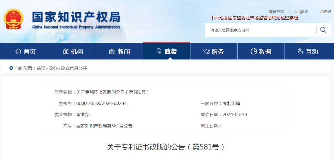 近日,國家知識產(chǎn)權局發(fā)布關于專利證書改版的公告(第581號),對于授權公告日在2024年6月1日之后(含當日)的專利,國家知識產(chǎn)權局頒發(fā)新版專利證書。新版專利證書沿用A4規(guī)格豎排版式,優(yōu)化調整著錄事項布局。