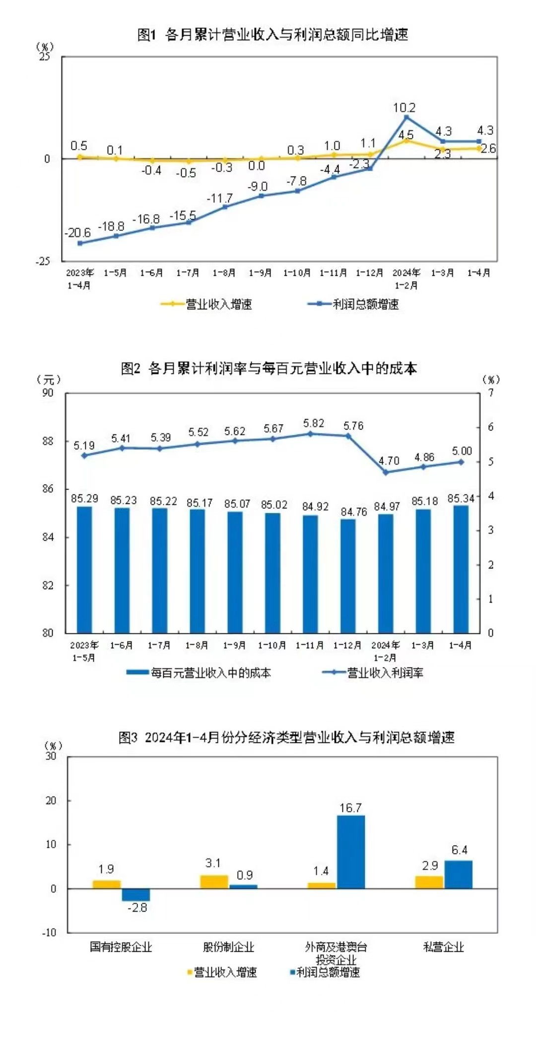 1—4月份,規模以上工業企業實現營業收入41.92萬億元,同比增長2.6%;發生營業成本35.77萬億元,增長2.8%;營業收入利潤率為5.00%,同比提高0.08個百分點。