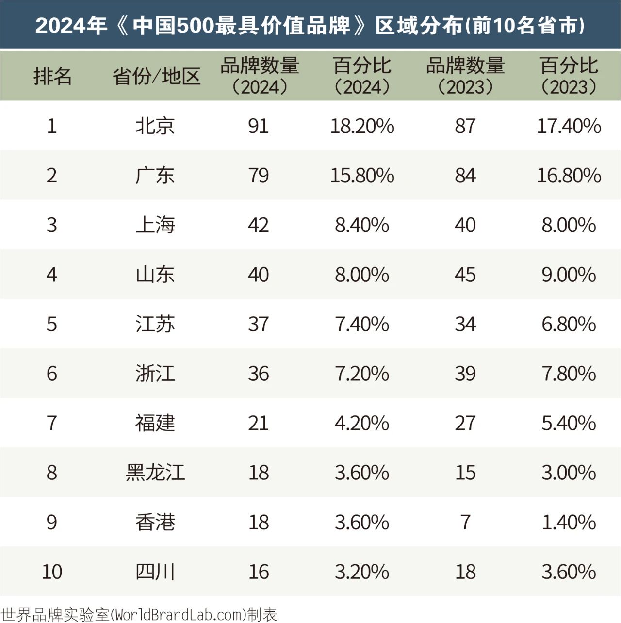 據世界品牌實驗室的專家組分析,一個區域的競爭實力,主要取決于其比較優勢,而品牌效益直接影響著地區比較優勢的形成和發展。品牌是一個地區發展的重要標志,品牌與區域經濟的增長是相互聯動的。從本屆《中國500最具價值品牌》區域分布來看,北京有91個品牌入選,名列第一,因為贏利能力強的央企總部集中在北京;廣東和上海分別有79個和42個品牌入選,位居第二和第三。根據入選品牌影響力范圍大小,可按照全國性、世界性品牌進行劃分。榜單中具有全國范圍影響力的品牌有431個,占86.20%;具有世界性影響力的品牌數為69個,占13.80%