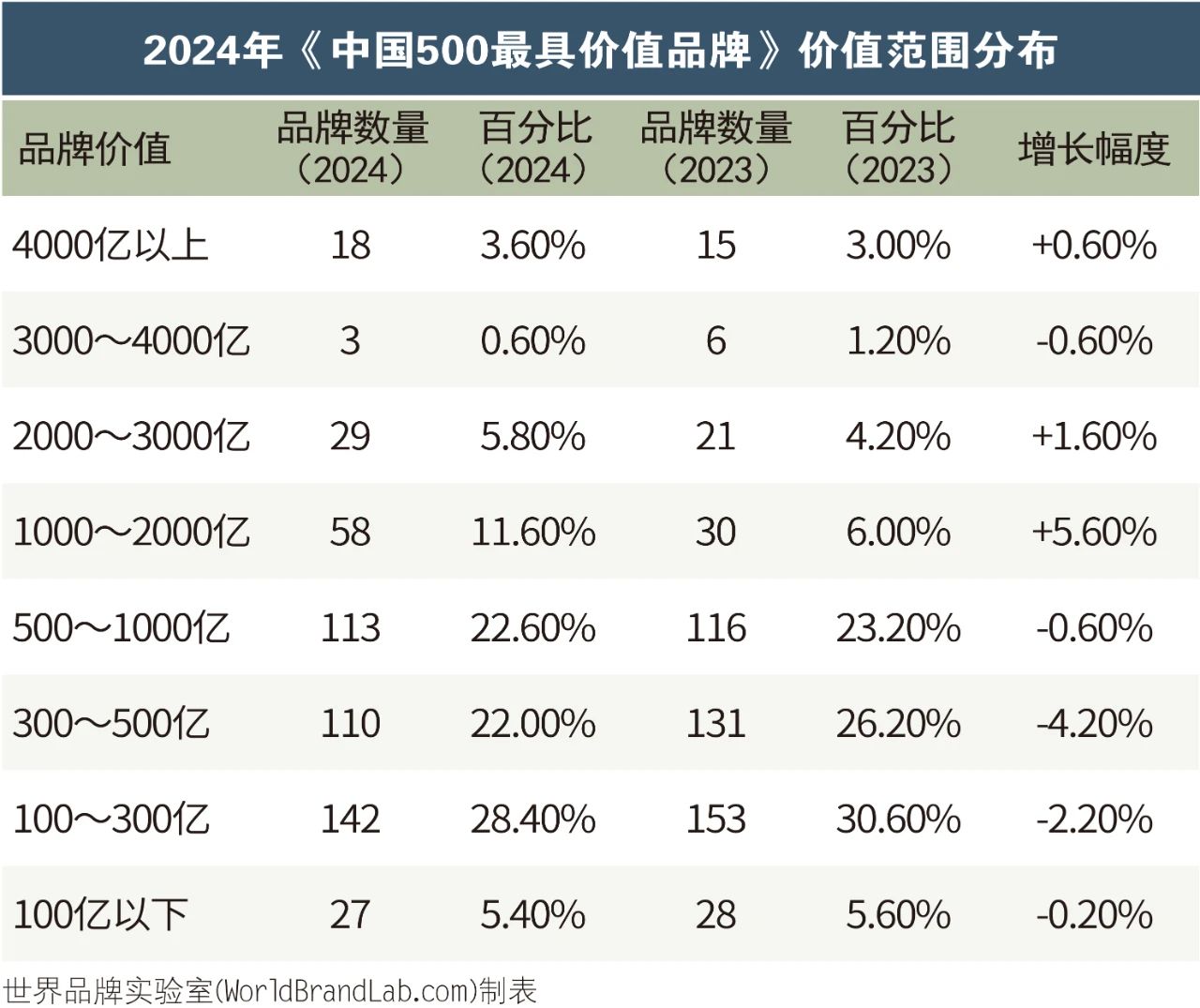 2024年《中國500最具價值品牌》的總價值為38.57萬億元,比去年增加4.24萬億元,增幅為12.35%。世界品牌實驗室學術委員會主席、牛津大學(Oxford)營銷學榮譽教授斯蒂芬·沃格(Steve Woolgar) 博士表示:“在過去的20多年中,我目睹了中國品牌的快速成長,有的已經具有強大的世界影響力,這些品牌包括國家電網、海爾、中化、華潤、中國南方電網、保利、河鋼、中國華電、五糧液、徐工、青島啤酒、中國國航、北大荒、東方電氣、通威、波司登、飛鶴、中國航油、恒力、協鑫、圣象、九牧、長虹、雙星輪胎等。