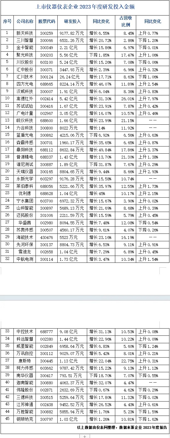 在此背景下,國內(nèi)儀器儀表企業(yè)對研究與開發(fā)方面的投入愈發(fā)重視,不斷引入創(chuàng)新,提高自身技術(shù)先進(jìn)性以生產(chǎn)出具有競爭力的高質(zhì)量產(chǎn)品,從而在這場發(fā)展機(jī)遇中占據(jù)有利地位。為方便業(yè)內(nèi)人士深入了解我國儀器儀表企業(yè)研發(fā)投入現(xiàn)狀,儀表網(wǎng)整理了國內(nèi)45家上市儀器儀表企業(yè)2023年度研發(fā)金額、研發(fā)投入占比等數(shù)據(jù),以饗讀者。