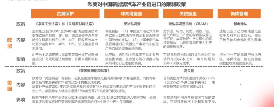 歐美近年來對中國新能源汽車產業鏈進口的若干限制政策摘要。霞光智庫&和君《中國新能源汽車出海十大趨勢洞察報告》,2024-5