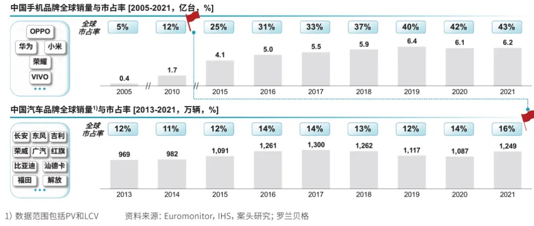 中國手機及汽車品牌發展軌跡對比。羅蘭貝格《中國車企出海白皮書》,2022-12