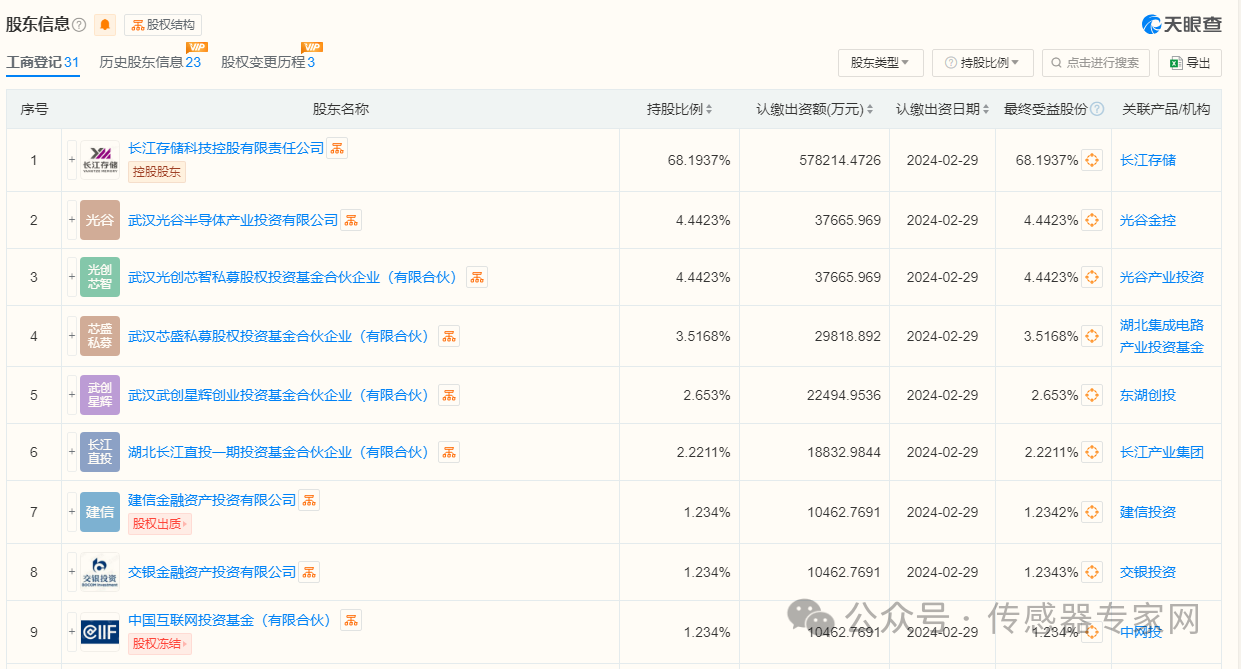 2024年2月29日,武漢新芯引入30多家投資機構,包括廈門炬達二號投資合伙企業(有限合伙),武漢金融控股,武漢光谷半導體產業投資有限公司,武漢光創芯智私募股權投資基金,國鑫創投,招銀國際,長投集團,謝諾投資,中信證券,中國農業銀行,中銀金融,湖北高投,恒盛融通投資,建信投資,中國工商銀行,東湖創投,交銀金融資產投資有限公司,海通創意資本,湖北長江直投等等。目前,武漢新芯的控股股東為長江存儲, 持股超68%。