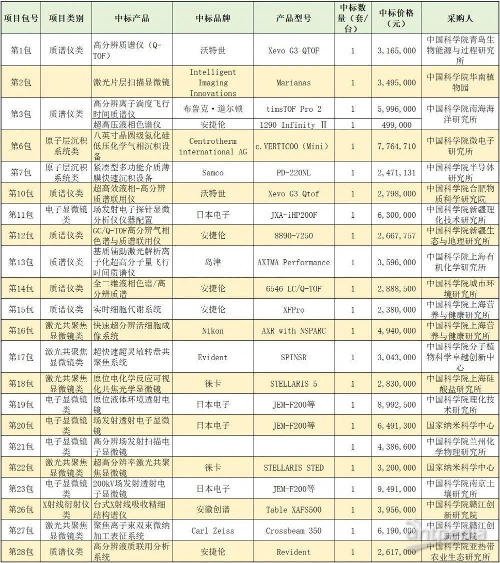 中標(biāo)的儀器品牌包括國(guó)際知名的安捷倫、沃特世、島津、布魯克·道爾頓、日本電子和徠卡等。