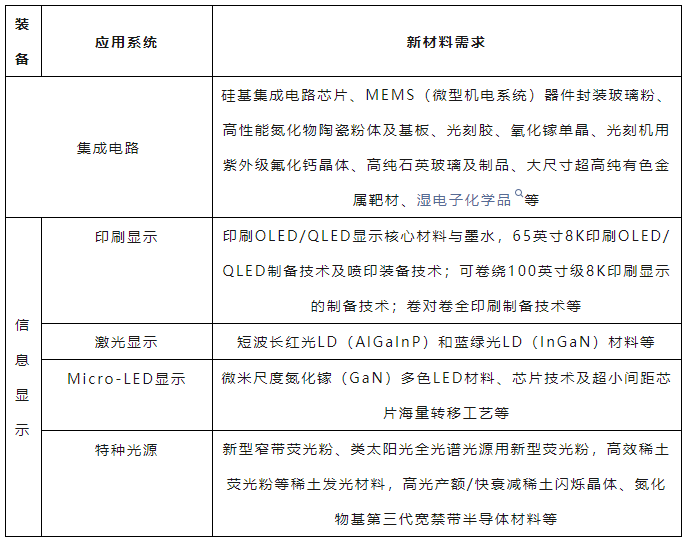 表3 信息顯示領域新材料需求