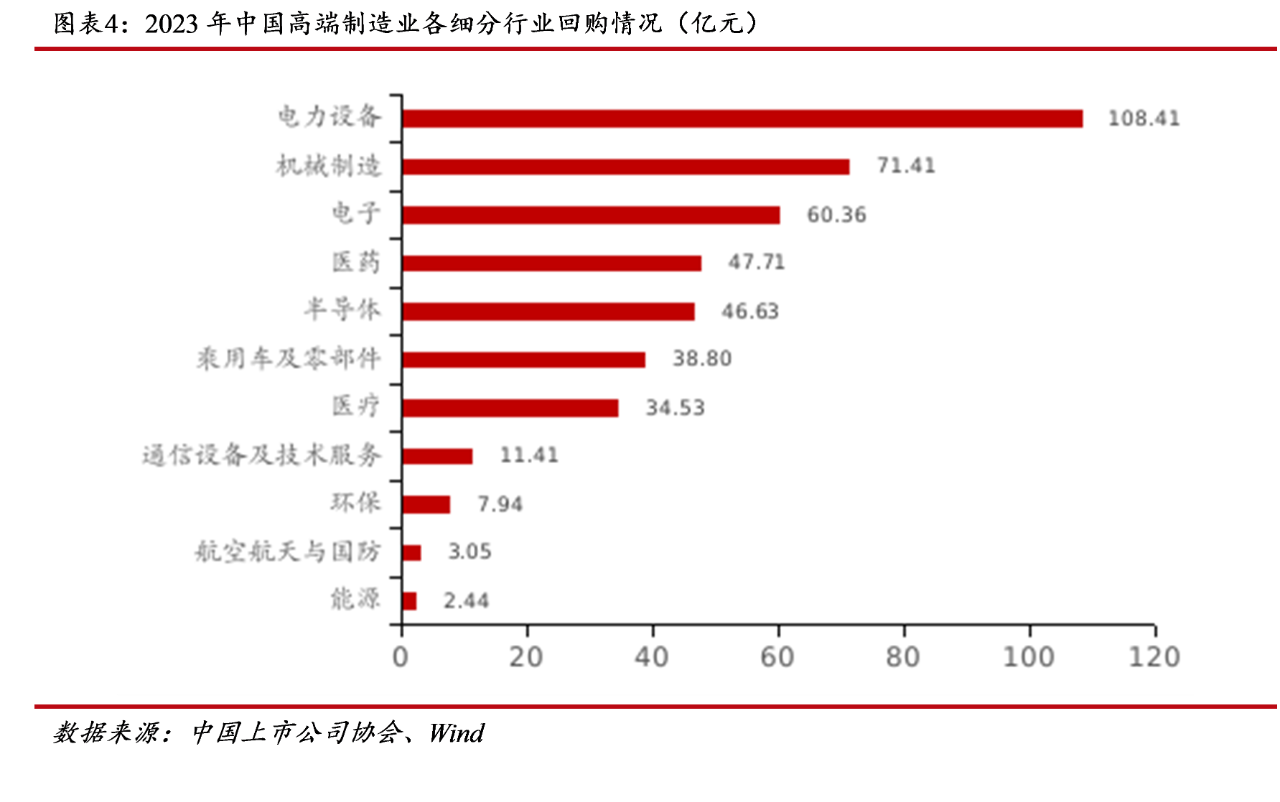 2023年度,高端制造業上市公司回購股份總額為432.69億元,回購股份總額最高的細分行業為電力設備行業,回購股份總額為108.41億元;機械制造及電子行業回購股份總額也均超過了50億元。