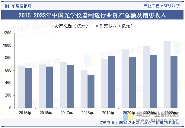 根據(jù)國家統(tǒng)計局數(shù)據(jù),近年來我國光學儀器制造行業(yè)資產(chǎn)總額及銷售收入總體呈現(xiàn)出增長態(tài)勢,2015-2022年,行業(yè)資產(chǎn)總額由674.99億元增長至1072.58億元,CAGR為6.84%,行業(yè)銷售收入由632.65億元增長至835.72,CAGR為4.06%。