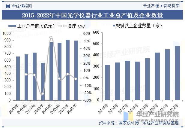 在電子技術和計算機行業(yè)發(fā)展的帶動下并伴隨著下游應用領域需求的日益增長,使得國內(nèi)光學儀器制造行業(yè)市場規(guī)模持續(xù)擴張。據(jù)統(tǒng)計,2022年中國光學儀器制造行業(yè)工業(yè)總產(chǎn)值稍有下滑,為898.23億元,同比減少1.38%。我國光學儀器制造行業(yè)規(guī)模以上企業(yè)數(shù)量逐年攀升,2015年光學儀器制造行業(yè)規(guī)模以上企業(yè)數(shù)量為314家,2022年提升至482家。