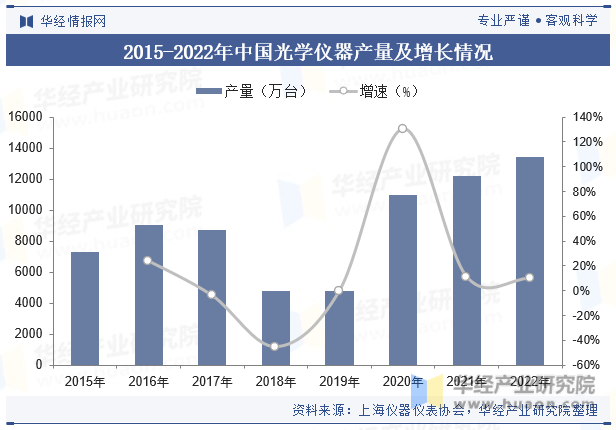 光學儀器是儀器儀表行業(yè)中非常重要的組成類別,從產(chǎn)量來看,近幾年國內(nèi)光學儀器產(chǎn)量大幅增長,2020年中國光學儀器產(chǎn)量突破1億臺,同比增速達130.35%,2022年產(chǎn)量增長至1.35億臺,同比上漲10.05%。