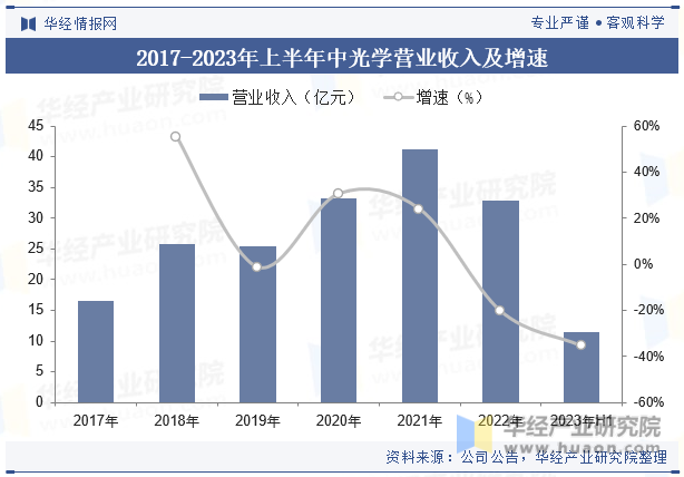 中光學集團成立于1991年,是中國光學儀器行業(yè)的領先企業(yè)之一。公司總部位于北京,擁有多個制造基地和研發(fā)中心,先后榮獲多項級獎項,是中國光學儀器行業(yè)的標志性企業(yè)。2022年受疫情反復、芯片短缺等綜合因素影響,營業(yè)收入下降至32.85億元,同比縮減20.44%,2023年上半年實現(xiàn)營收11.5億元,較2022年同比減少35.54%。