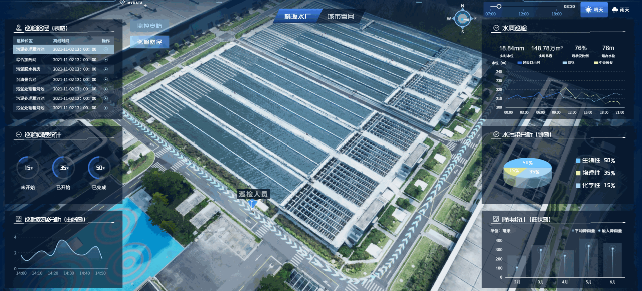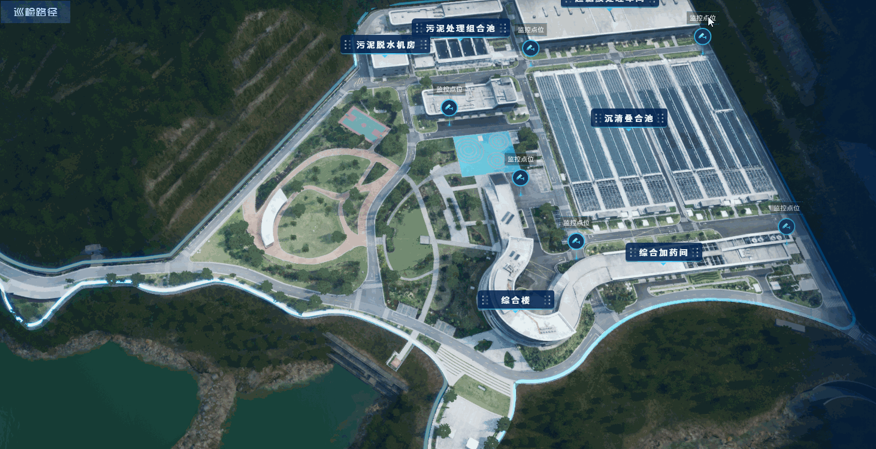 該項目位于位于福建省,設(shè)計規(guī)模10萬m³/d,項目旨在通過打造該水廠數(shù)字孿生可視化管理平臺,提高水廠智能化管理水平。基于BIM數(shù)據(jù)或CAD圖紙,項目對廠區(qū)進(jìn)行三維建模,還原廠區(qū)建筑物、構(gòu)筑物、工藝區(qū)間、設(shè)備等三維全貌,實時監(jiān)控廠區(qū)各項參數(shù),提供數(shù)據(jù)展示,設(shè)備信息查看等功能,為運營管理提供場景式的決策支持;采用3D渲染技術(shù)及VR虛擬現(xiàn)實技術(shù),打造沉浸式、智慧化的運營管理模式。正泰中自的水務(wù)數(shù)字孿生技術(shù)可以幫助智慧水廠更好地集成和理解生產(chǎn)信息、提升管理效能。