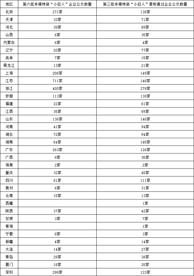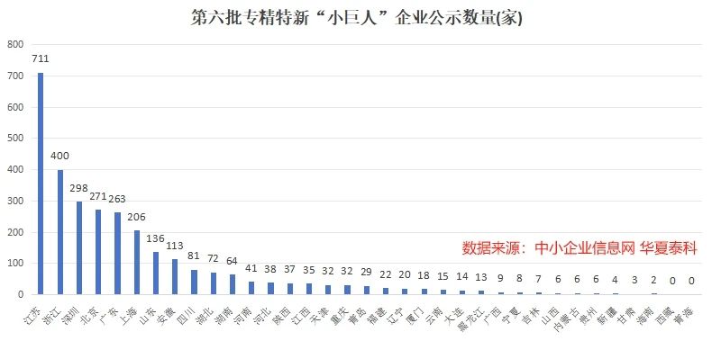 第六批專精特新企業(yè)的分布省市情況呈現(xiàn)出明顯的地域差異,經(jīng)濟大省的“小巨人”企業(yè)數(shù)量遙遙領(lǐng)先。在此次公示的第六批專精特新 “小巨人” 企業(yè)中,江蘇、廣東(含深圳)和浙江數(shù)量較多,分別有711家、561家和400家,三個省份“小巨人”企業(yè)數(shù)量占比超過一半。