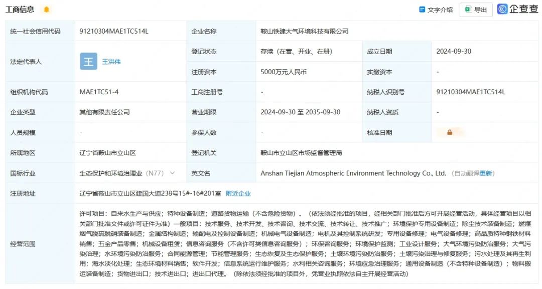近日,鞍山鐵建大氣環(huán)境科技有限公司成立,法定代表人為王洪偉,注冊(cè)資本5000萬元,經(jīng)營范圍包含:大氣環(huán)境污染防治服務(wù);大氣污染治理;水環(huán)境污染防治服務(wù);合同能源管理等。