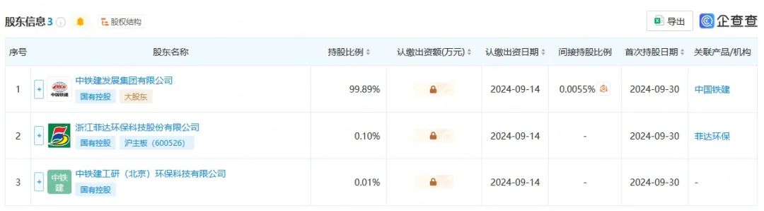 股權(quán)穿透顯示,該公司由中國鐵建全資子公司中鐵建發(fā)展集團(tuán)有限公司、菲達(dá)環(huán)保、中鐵建工研(北京)環(huán)保科技有限公司共同持股。